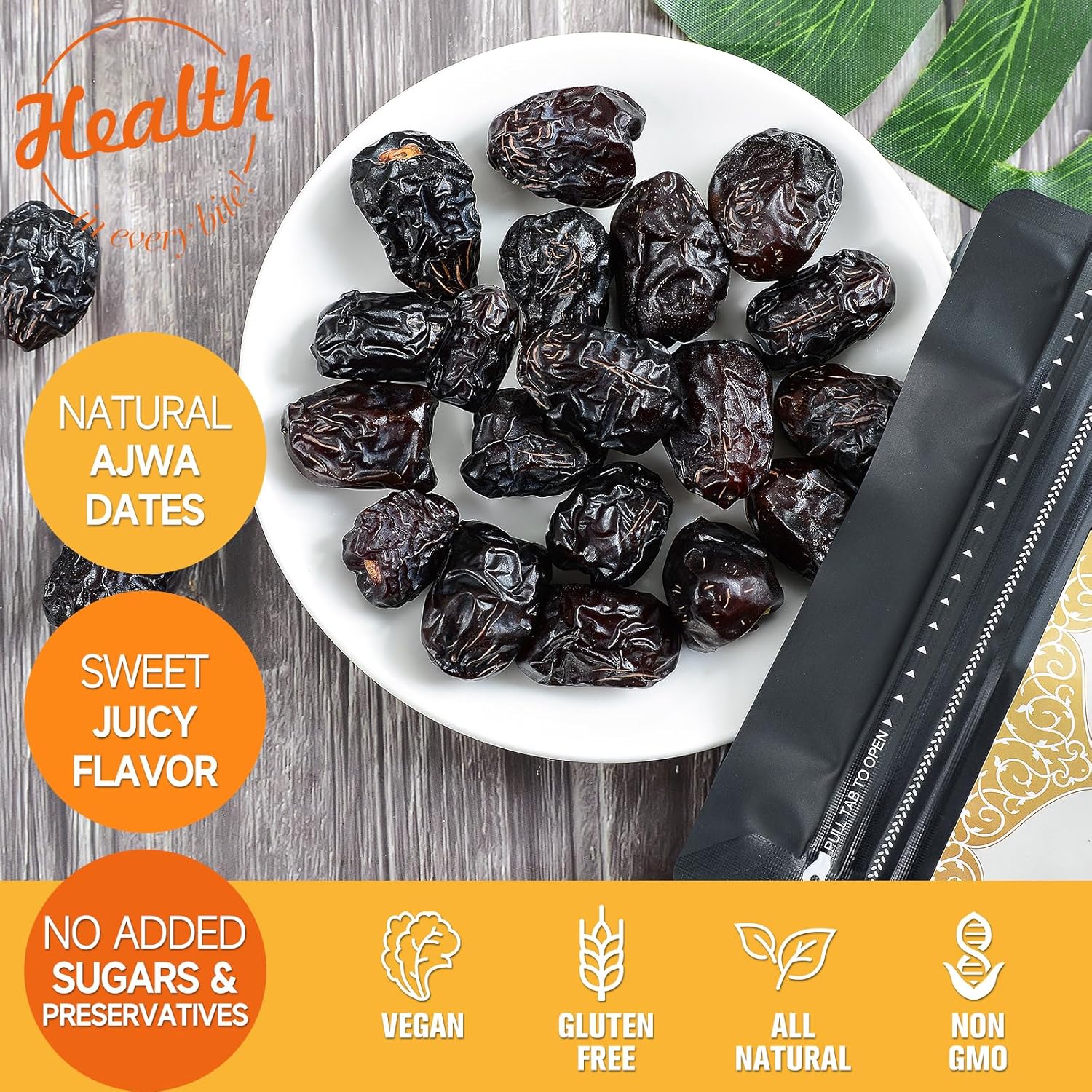 Nutrient-Rich Healthy Snack: Elevate your health with Ghldmj’s nutrient-packed Ajwa dates, planted in the core production area of Medina, Saudi Arabia,rich in essential vitamins, minerals, and high fibre. It helps digestion.These dates are a natural energy booster, offering sustained vitality without the crash of processed sugars.